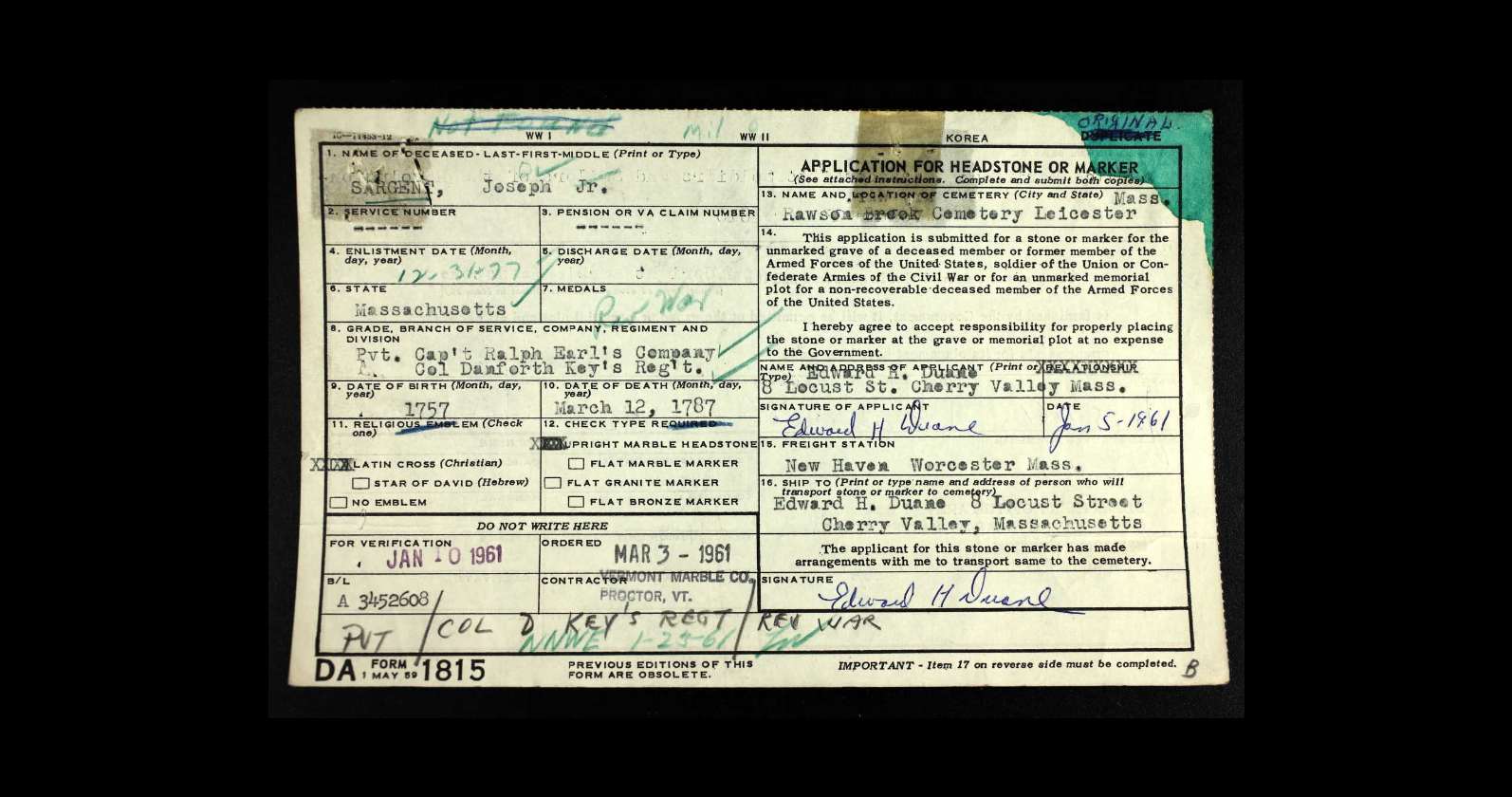 - [S5498] US Headstone Applications for Military Veterans 1925-1963, online image database, digitized by ancestry.com Operations Inc, 2012, www.ancestry.com. (Original publication: Records of the Office of the Quartermaster General Applications for Headstones for U S Military Veterans 596118 1925-1941, Record group 92, National Archives, Washington DC,) Joseph Sargent Jr - application for headstone for unmarked grave of a former member of the US Armed Forces.