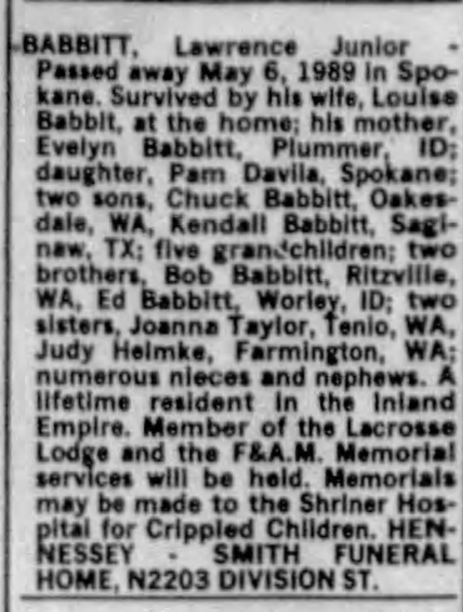 - Lawrence Junior Babbitt died on 6 May 1989 in Spokane, Washington, at age 62.5