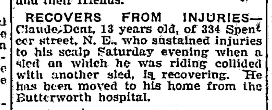 - [S9566] Find A Grave: Fairplains Cemetery, Grand Rapids, Michigan, Claude WilliamDent, created by Julie & Tom York, KrazyCraftyLady, added Sep 2006, memorial number 15949055.