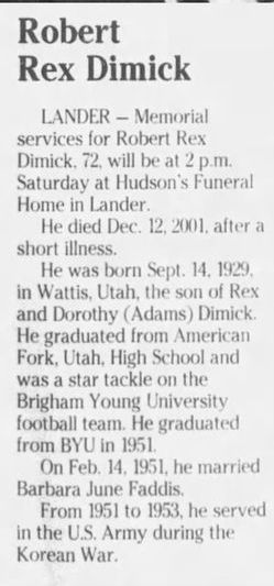- Robert Rex Dimick was born on 14 September 1929 in Wattis, Utah.1