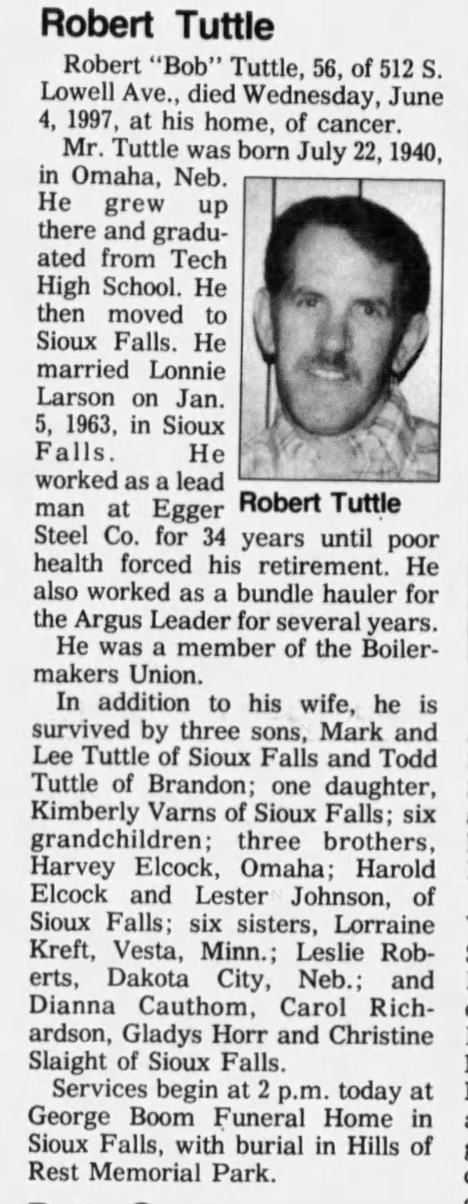 - [S9602] Find A Grave: Hills of Rest Memorial Park, Sioux Falls, South Dakota, Robert A Tuttle, created by Dr Marie C Karban DVM ret, added Jun 2011, memorial number 71644990.