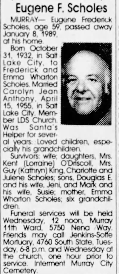 - Eugene Frederick Scholes died on 8 January 1989 in Murray, Utah, at age 56.2