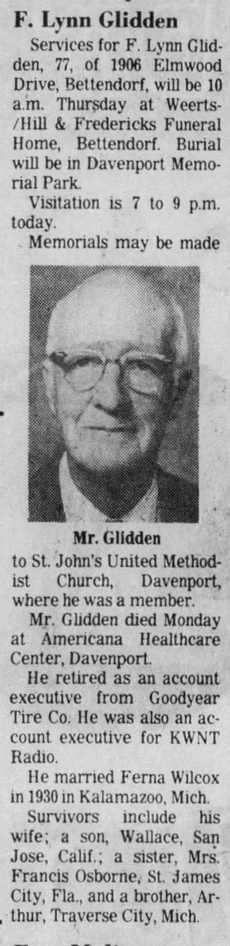 - [S9401] Quad-City Times, Davenport IA, paper newspaper, obituary notice F Lynn Glidden, published 27 Aug 1980 p 10.