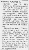 - [S7459] Democrat and Chronicle, Rochester, NY, Newspaper, Obituary notice Charles A Hiscock, published 19 Nov 1975 p 47.