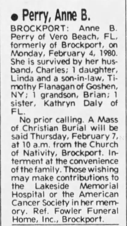 - [S7459] Democrat and Chronicle, Rochester, NY, Newspaper, obituary notice Anne B Perry, published 6 Feb 1980 p 33.