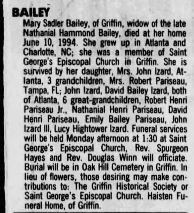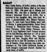 - [S9549] The Atlanta Constitution, Atlanta GA, Newspaper, Mary Sadler Bailey obituary notice published 11 Jun 1994 p 31.