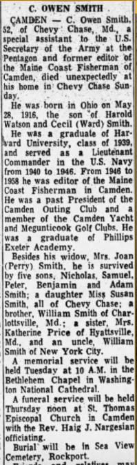 She and the family lived in Chevy Chase, Maryland, for eight years when Owen was the assistant to the Secretary of the Army during the Johnson administration, returning to Camden every summer and then permanently when Owen died in 1968.