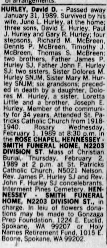 - [S8238] The Spokesman-Review, Spokane, WA, Newspaper, obituary notice David D Hurley, published 2 Feb 1989 p 37.