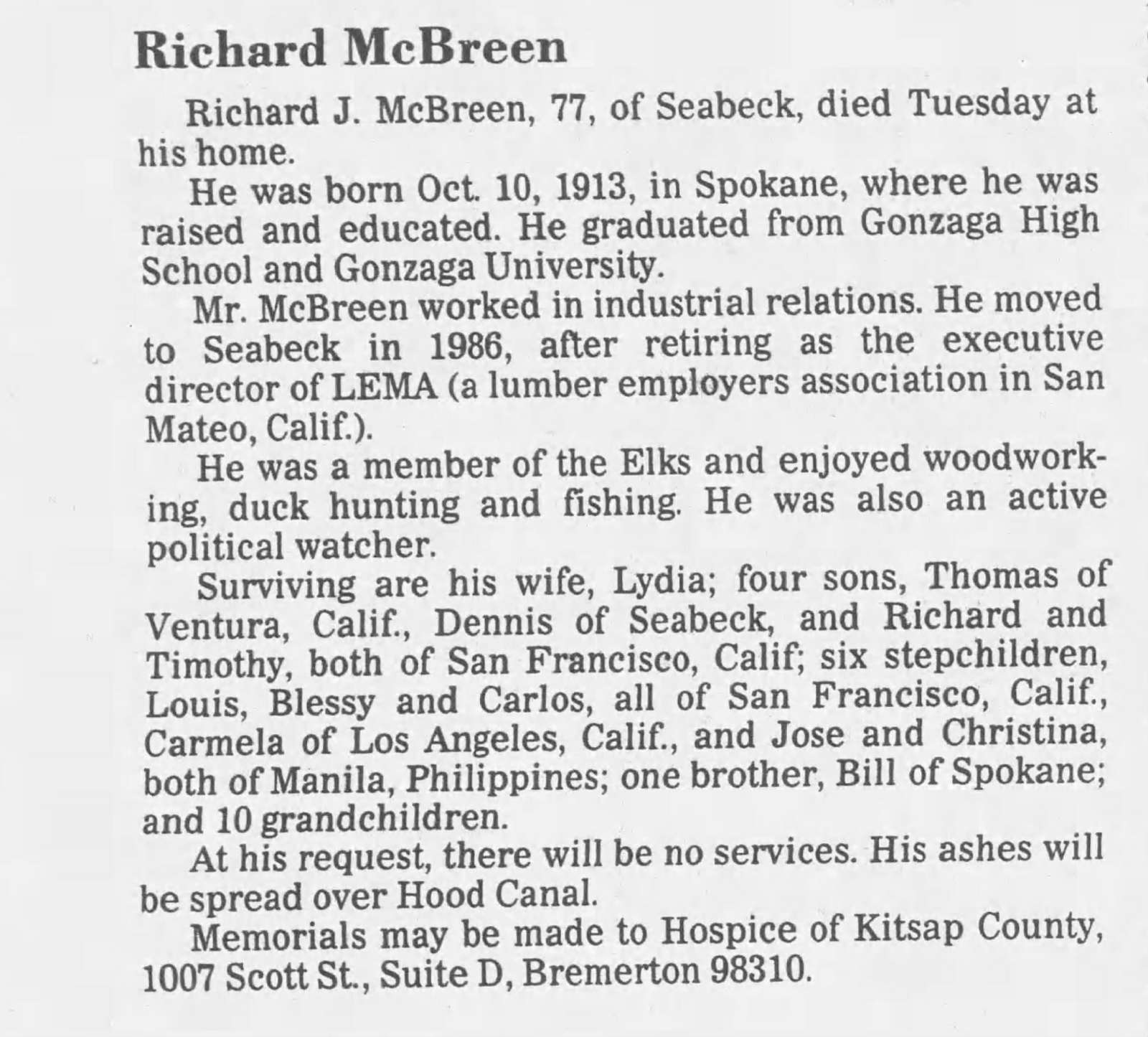 - [S9750] Kitsap Sun, Bremerton WA, Newspaper, obituary notice Richard McBreen published 12 Sep 1991 p 10.