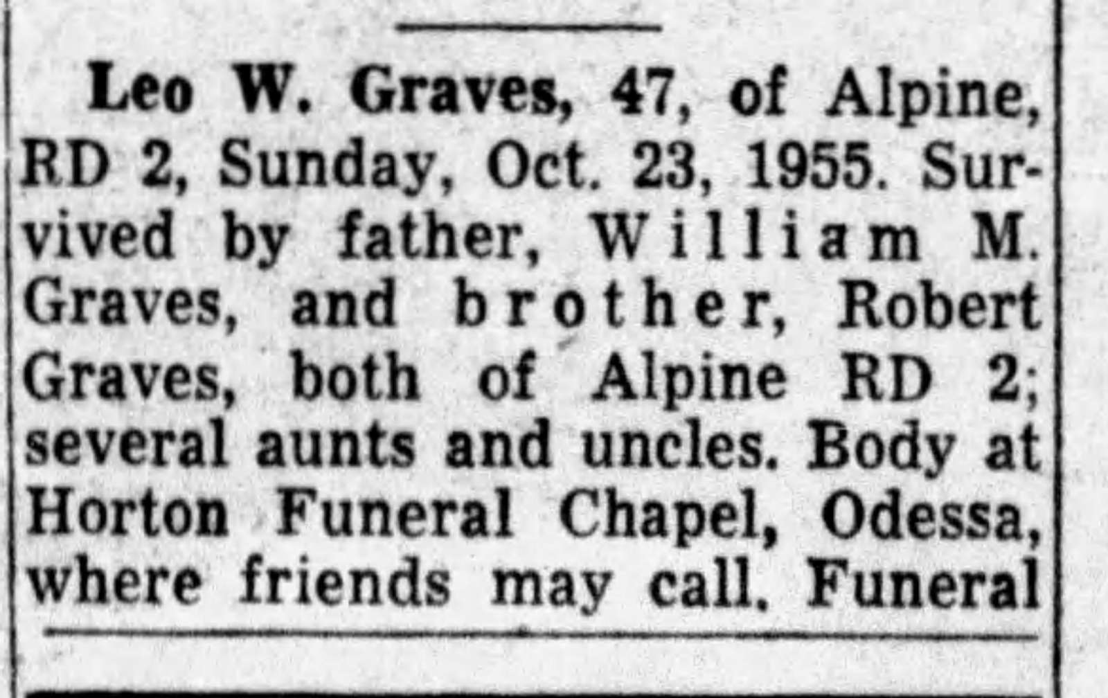 He is survived by his wife, Winifred Graves; two sons, Robert Graves and wife Brenda of Aurora and William Earl Graves and wife Doloris of Melrose, N.Y.; a daughter, Buna Mae Boor of Horseheads, N.Y.; three grandchildren, Stephen, Lorraine and Jamie; four great-grandchildren, Franco, Jaslisa, Briana, Daniel Emanuel; eight stepgrandchildren, Sally Jean, Bobbie Gay, Gregg, Brenda Lee, Billy Joe, Shelba, Joe and Bridgette; several great-grandchildren, nieces and nephews.
