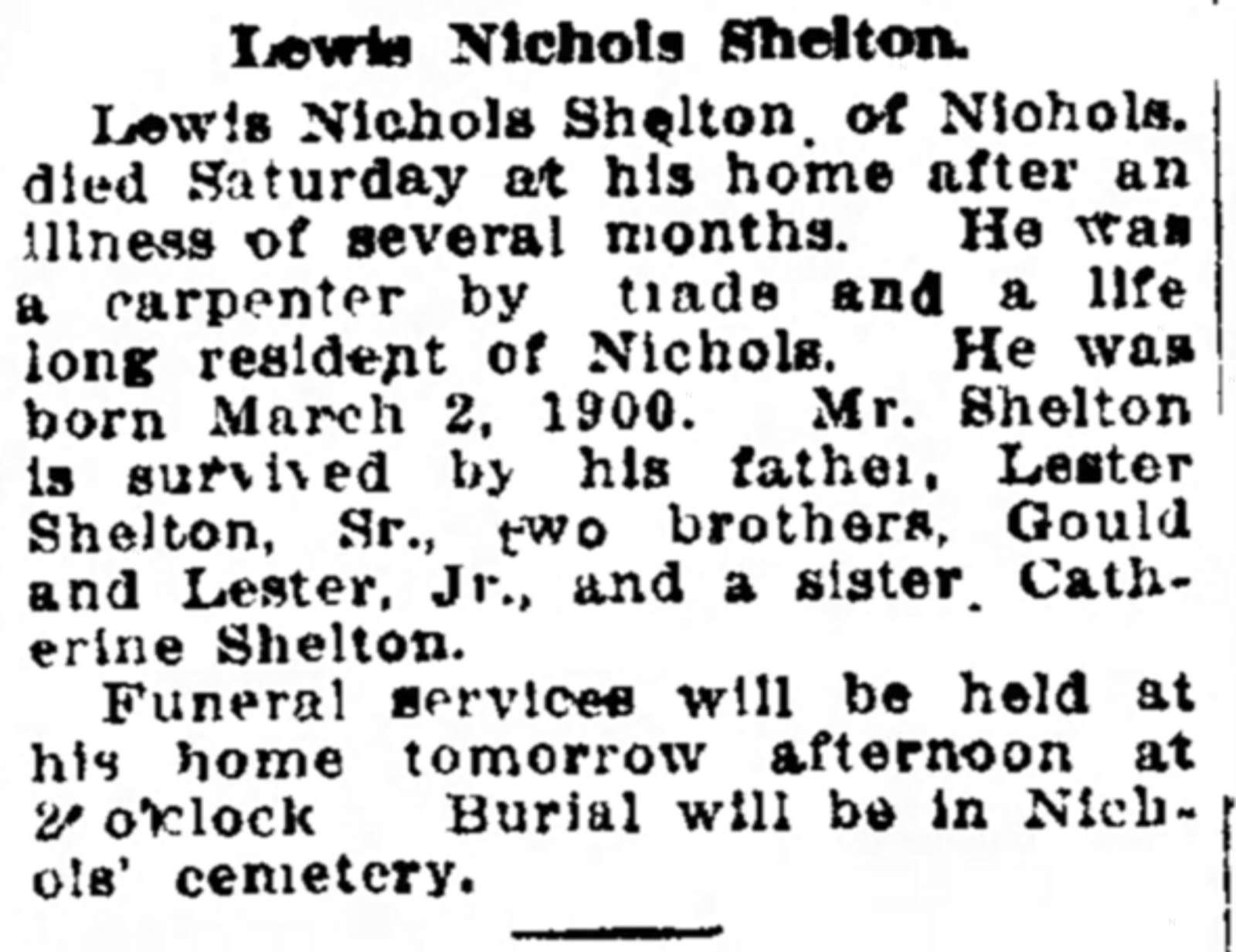 - Lewis Nichols Shelton died on 20 December 1925 in Trumbull, Connecticut, at age 25.1