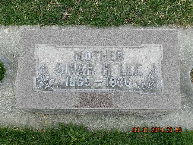 - [S2410] Find A Grave: American Fork Cemetery, American Fork, Utah, Sinah Nina Hoggard Lee, created by FamilyHistorian, Lee Drew, added Jun 2011, memorial number 70884960.