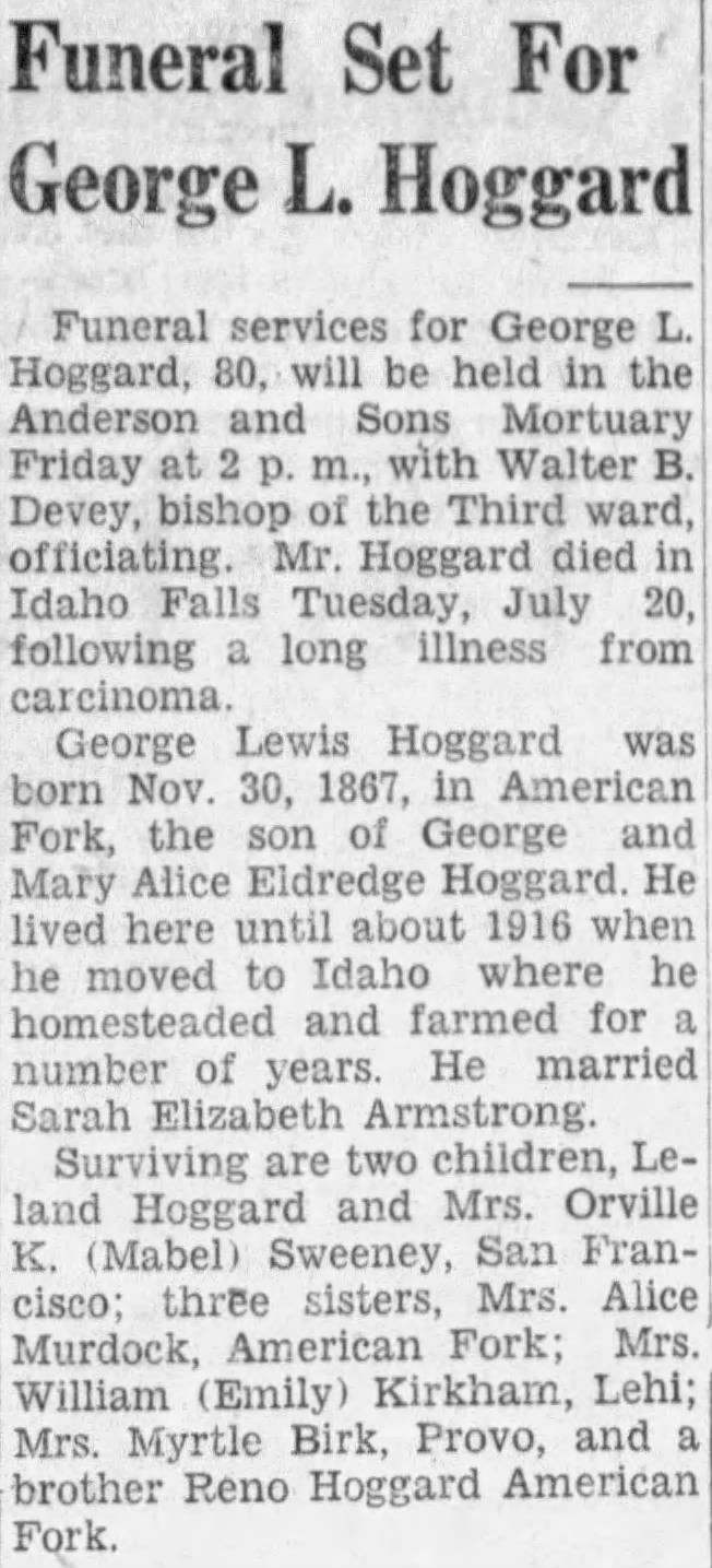 - [S2410] Find A Grave: American Fork Cemetery, American Fork, Utah, George Lewis Hoggard, created by Marlin J Haws, Lee Drew, added Jan 2003, memorial number 7085481.