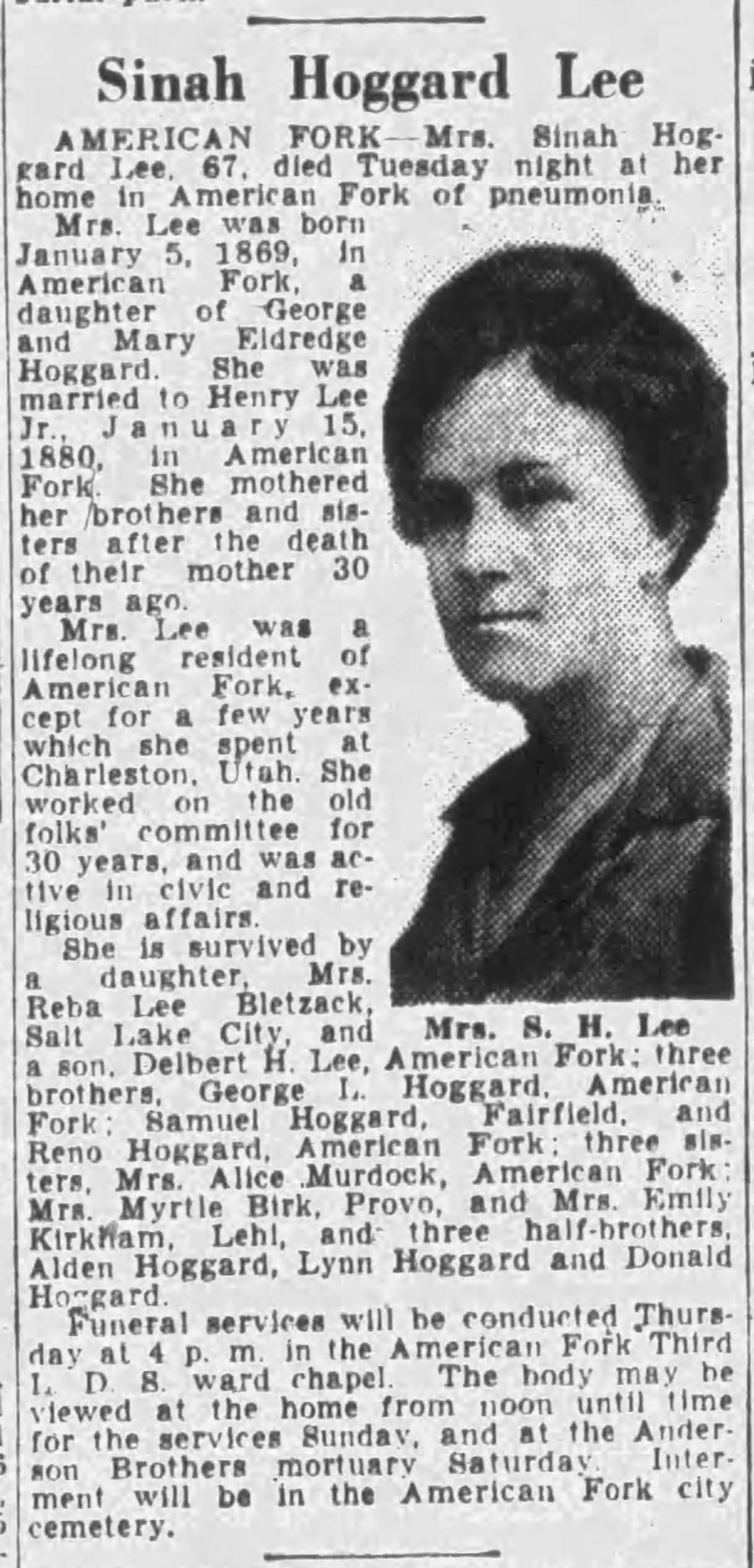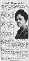 - [S2481] The Salt Lake Tribune, Salt Lake City, Utah, Newspaper, Obituary notice Sinah Hoggard Lee, published 6 mar 1936 p 26.