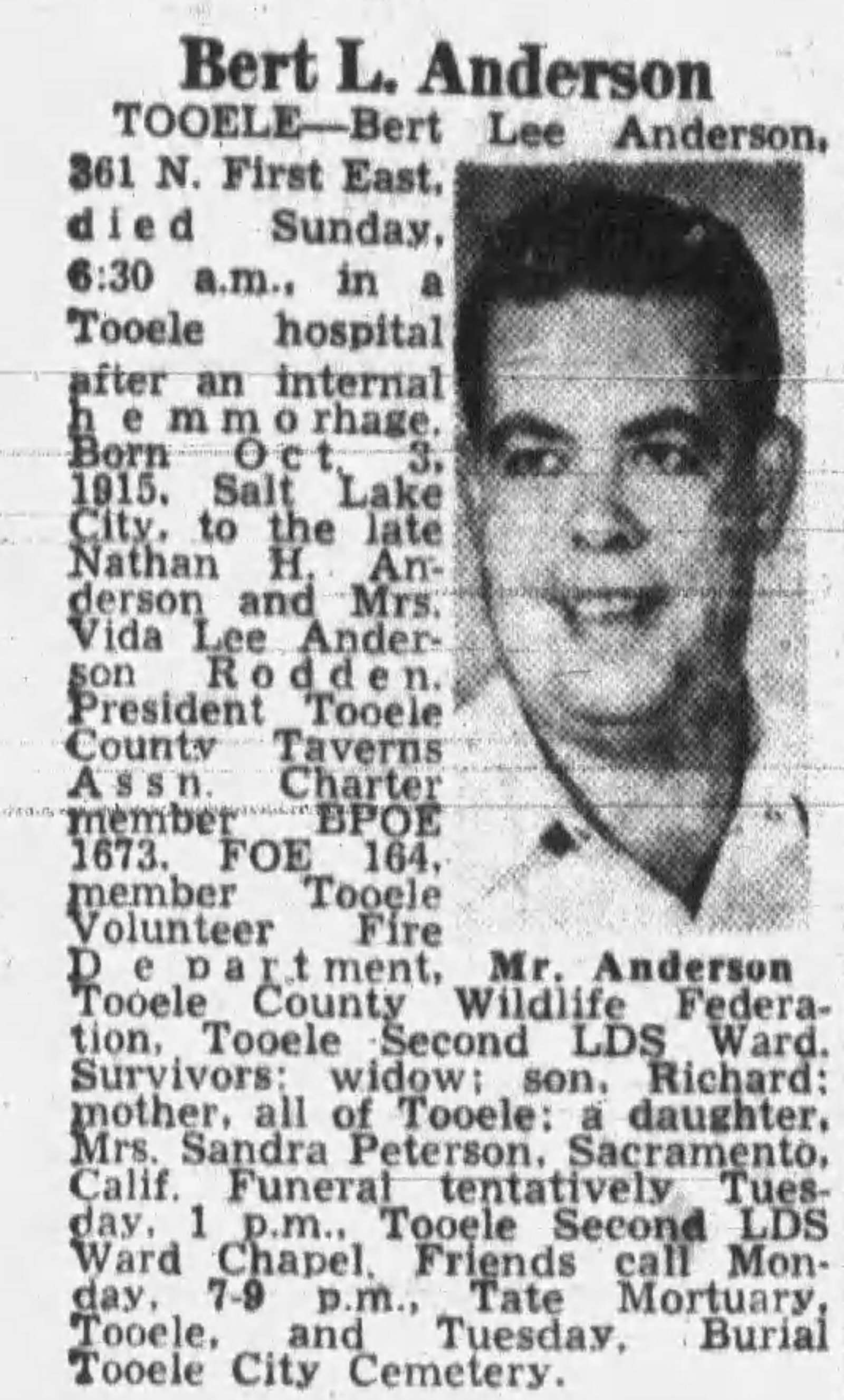 She survived by a daughter, Sandra Lee Peterson (Wayne), Monroe, UT; son, Richard Nathan Anderson (Sherry), Greenwood, SC and sisters, Josephine Leary, West Valley City, Louise Milicic, Rohner Park, CA