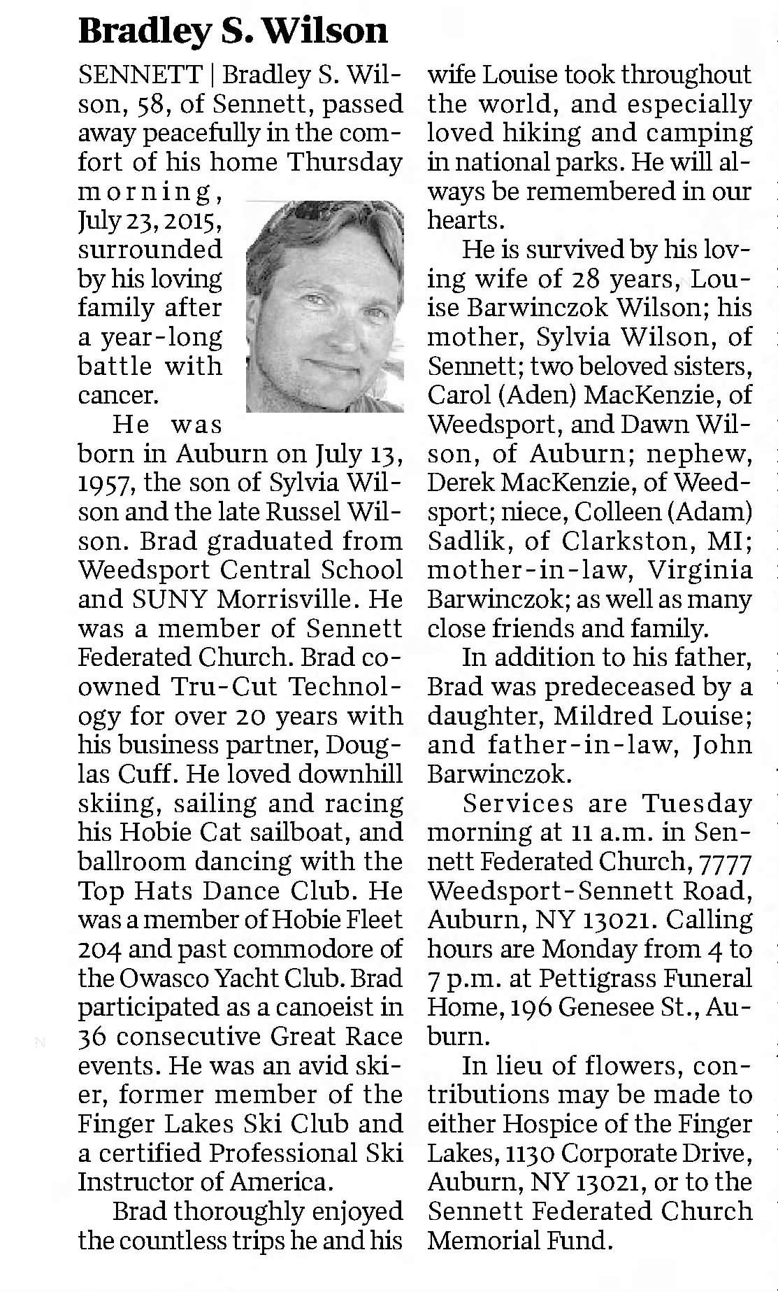 - [S9985] , Bradley S Wilson obituary, published 26 Jul 2015 p A5.