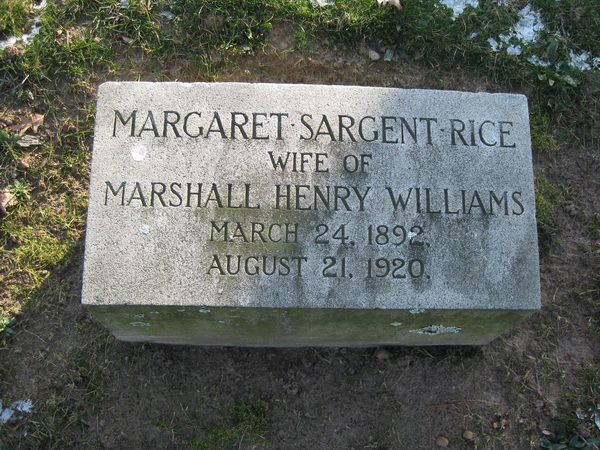 - [S5601] Find A Grave: Evergreen Cemetery, New Haven, Connecticut, Margaret Sargent Rice Williams, created by DWV, added Jun 2015, memorial number 147403511.