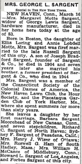 - [S44] The New York Times, New York City, Newspaper, Mrs George L (Margaret Motte) Sargent, obituary notice, published 17 Mar 1944, p 25.