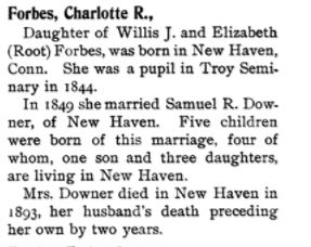 - [S5349] Find A Grave: Grove Street Cemetery, New Haven, Connecticut, Charlotte Root Forbes Downert, created by Jan Franco, added Apr 2007, memorial number 18794792.