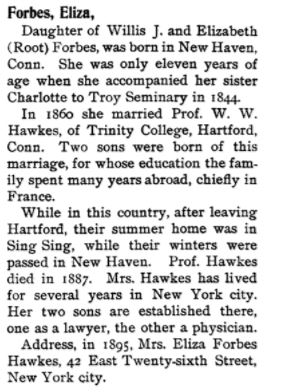 - [S5349] Find A Grave: Grove Street Cemetery, New Haven, Connecticut, Eliza Forbes Hawkes, created by The Guardian, added Apr 2007, memorial number 18727600.