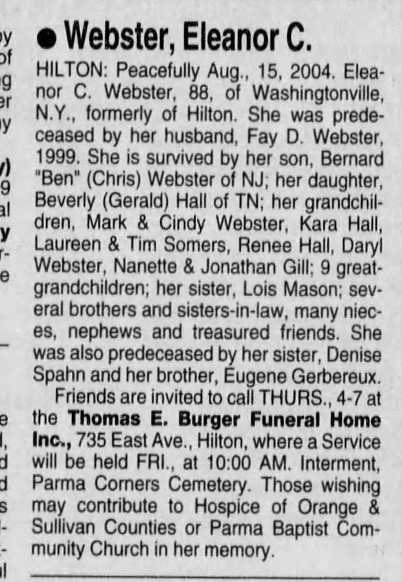- [S7459] Democrat and Chronicle, Rochester, NY, Newspaper, obituary notice Eleanor C Webster, published 18 Aug 2004 p 14.