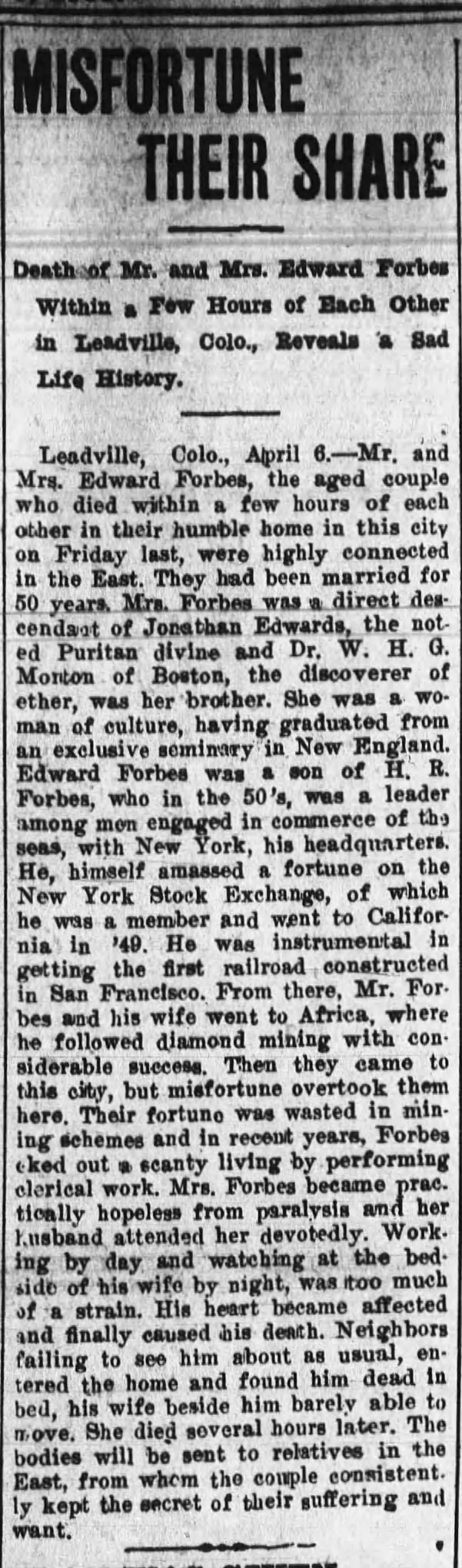 - [S623] Boston Evening Transcript, Boston MA, Newspaper, Edward Forbes, Ellen Forbes, obituary notice, published 6 Apr 1908, p 16.