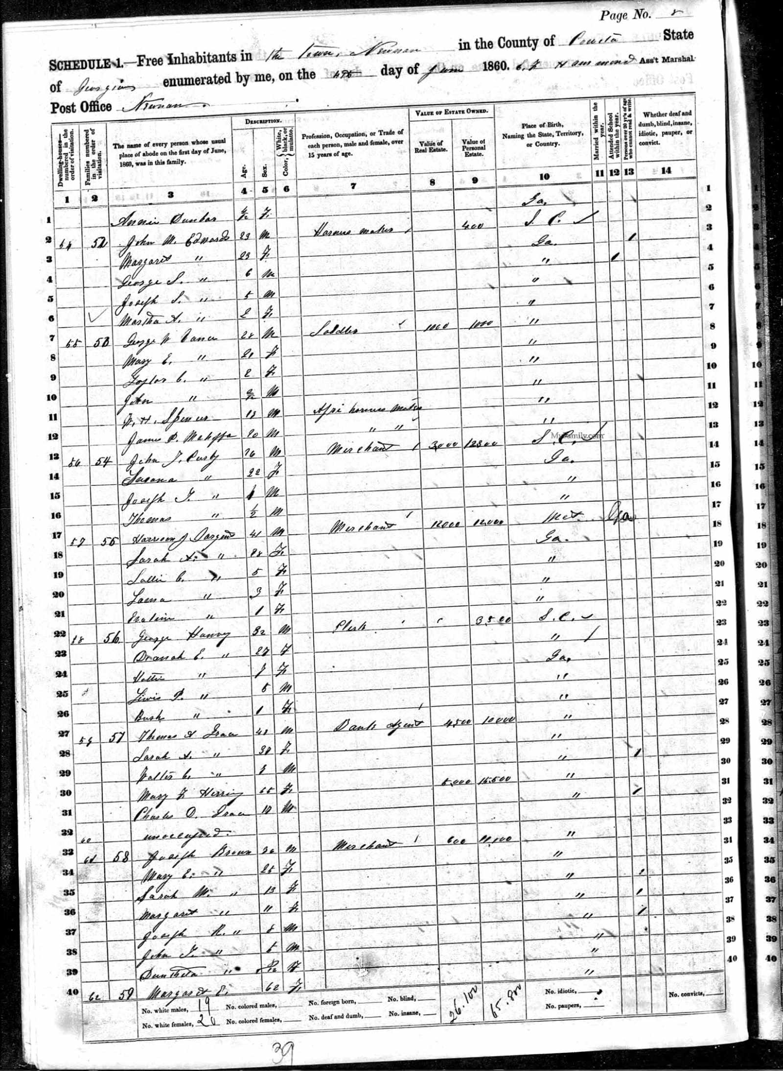 - He and Sarah appeared on the 1860 US Federal Census of Newnan, Coweta County, Georgia, enumerated on 4 June 1860. Value of real estate: $12,000. Value of personal property: $12,000.3