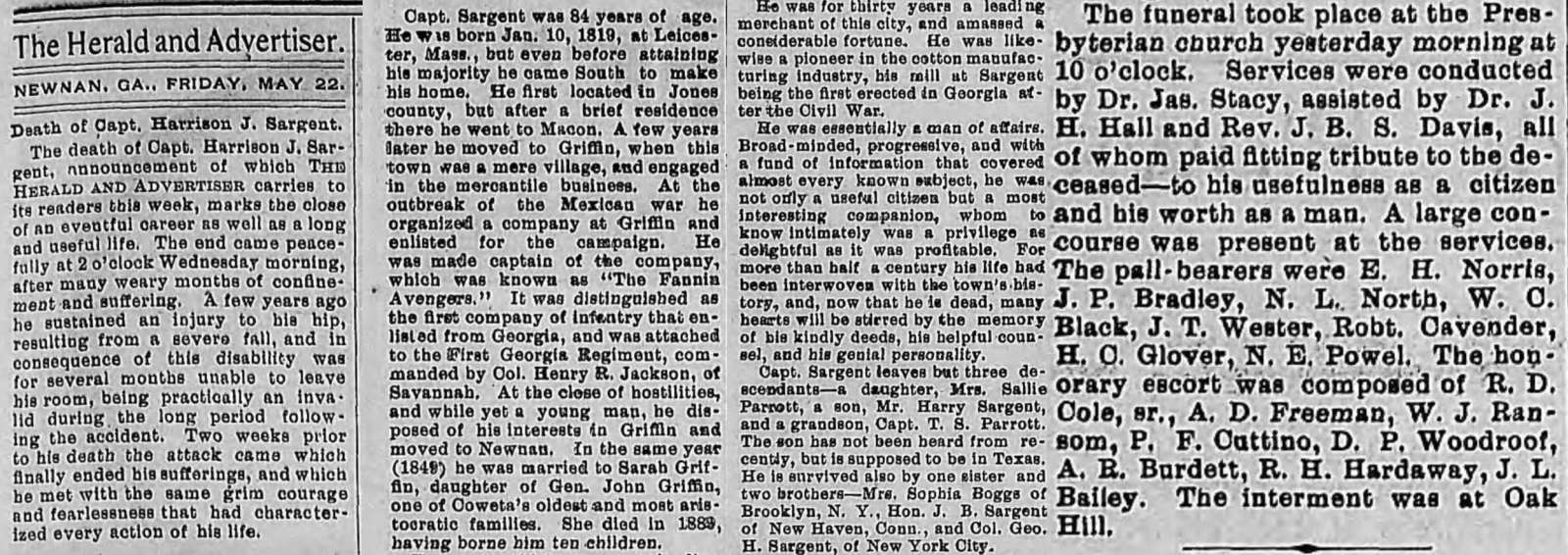 - [S4027] Find A Grave: Oak Hill Cemetery, 1 Jefferson St, Newnan, Georgia, Harrison Jones Sargent created by Autumn, date added Mar 2008, Memorial number 25083300.
