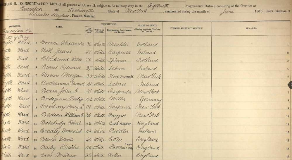 - In June 1863 Matthew appeared on a list of men subject to military duty (the Civil War) betwee the ages of 20 and 35. He was listed in the 5th Ward of Troy in Rensselaer County. His stated his age as 39 - not quite true, but I assume he didn't want to be in the draft.9