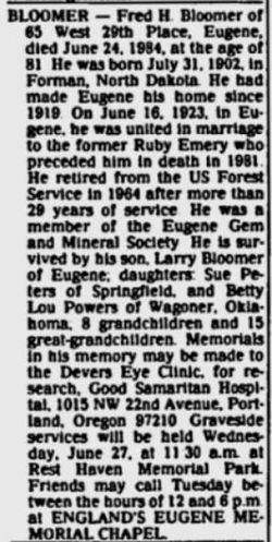 - [S6402] Find A Grave: Rest-Haven Memorial Park, Eugene, Oregon, Fred Herbert Bloomer, created by Rebecca Boardman, added May 2011, memorial number 69610529.