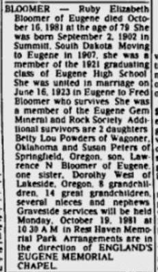 - [S6402] Find A Grave: Rest-Haven Memorial Park, Eugene, Oregon, Ruby Elizabeth Emery Bloomer, created by Rebecca Boardman, added May 2011, memorial number 69610581.