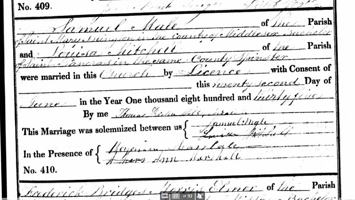 - They were married by Thomas Barton Hall, curate. At the time of marriage Samuel was living in St Mary Parish & Louisa was living in St Pancras Parish.4