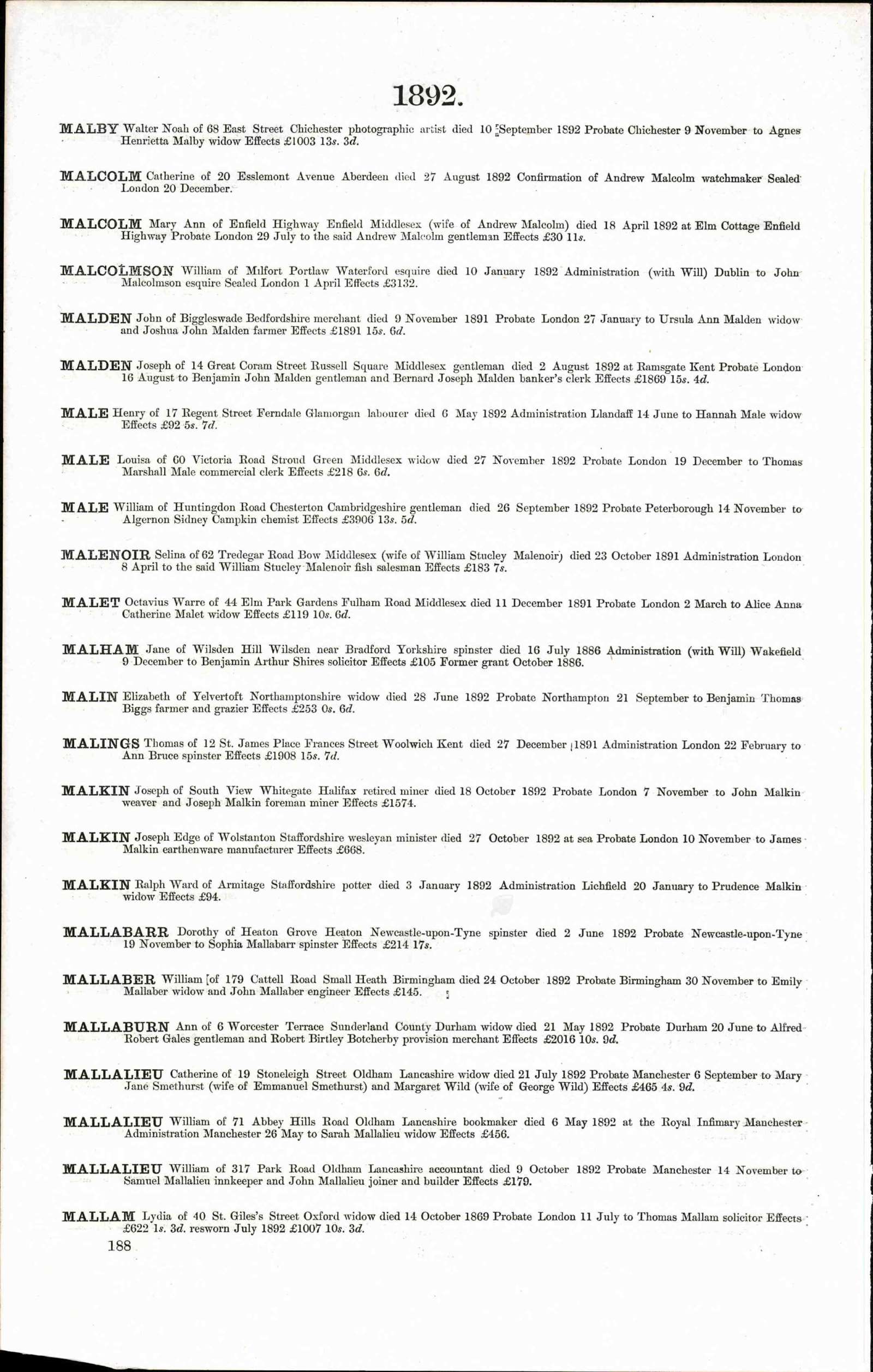 - [S73] England & Wales, National Probate Calendar (Index of Wills and Administrations), 1861-1941, online transcription database, digitized by Ancestry.com Operations Inc, 2010 www.ancestry.com. (Original publication: Principal Probate Registry, Calendar of the Grants of Probate and Letters of Administration made in the Probate Registries of the High Court of Justice in England, unknown publisher).