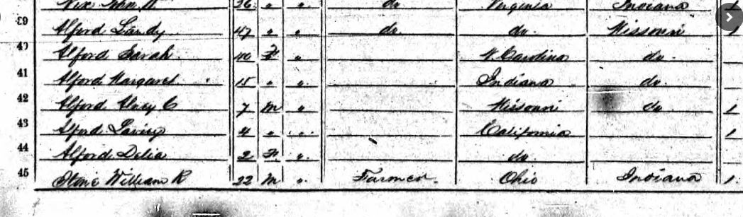 - He and Sarah appeared on the 1850 US Federal Census of town not stated, Solano County, California, enumerated on 20 November 1850. reporting real estate value of $3,000. Another daughter was listed; no first name. Also not with the same household was John Alford age 7 b Missouri & Emily Alford age 3 b Missouri.6