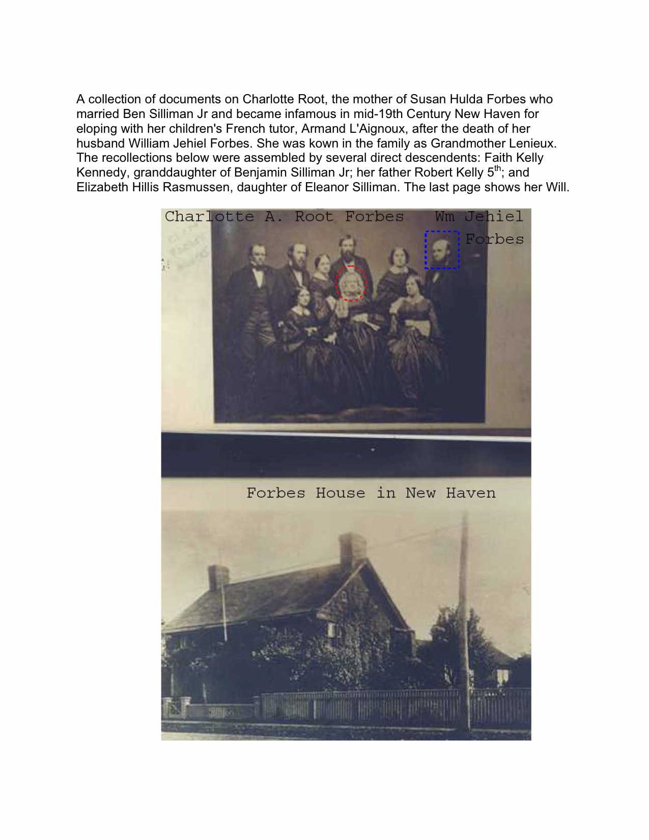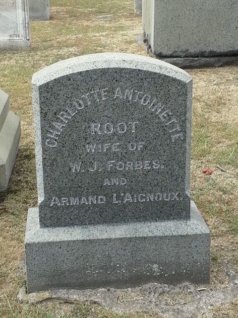 - [S5349] Find A Grave: Grove Street Cemetery, New Haven, Connecticut, Charlotte Antoinette Root Forbes, created by L Evans, added Oct 2014, memorial number 136827742.