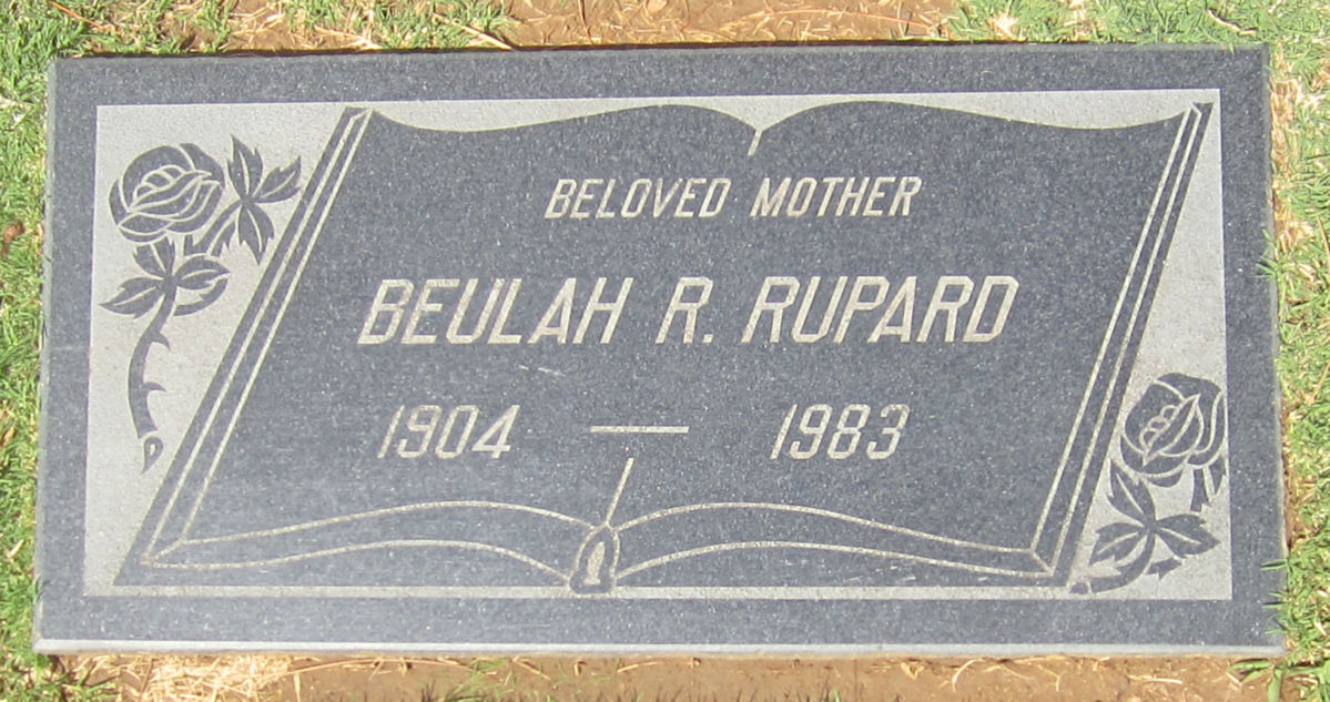 - [S4341] Find A Grave: Inglewood Park Cemetery, Inglewood, California, Beulah Ruth Stolp Rupard, created by BJW, Chris Mills, added Oct 2011, memorial number 78788251.