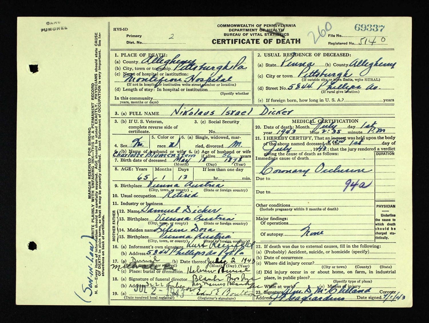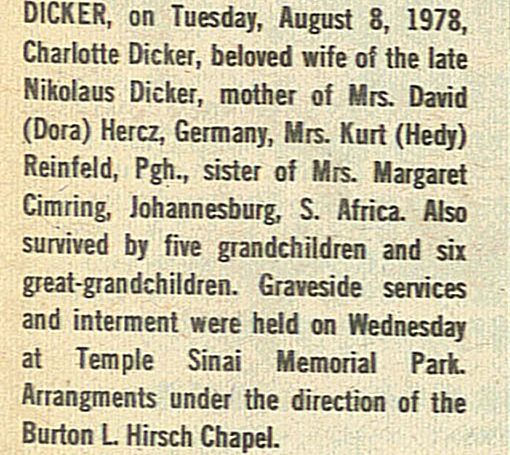 Charlotte Dicker, beloved wife of the late Nikolaus Dicker, mother of Mrs. David (Dora) Hercz, Germany, Mrs. Kurt (Hedy) Reinfeld, Pgh., sister of Mrs. Margaret Cimring, Johannesburg, S. Africa. Also survived by five grandchildren and six great-grandchildren. Graveside services and interment were held on Wednesday at Temple Sinai Memorial Park. Arrangments under the direction of the Burton L. Hirsch Chapel.