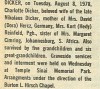 Obituary Notice for Charlotte Dicker, on Tuesday, Aug 8, 1978.