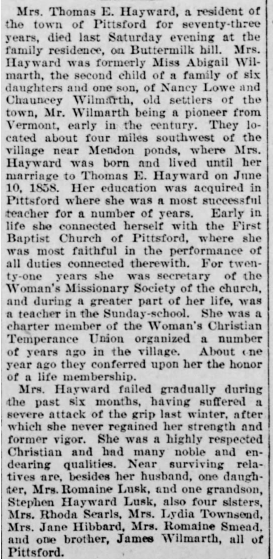 - [S7661] Find A Grave: Pittsford Cemetery, Pittsford, New York, Abigail Wilmarth Hayward, created by Vicki Masters Profitt, added Feb 2014, memorial number 125086870.