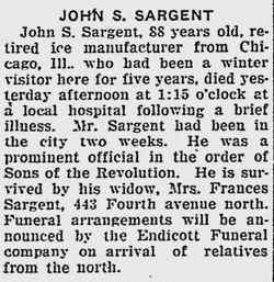 - [S4462] Find A Grave: Pine Grove Cemetery, Leicester, Massachusetts, John S Sargent, created by Sherry, added Aug 2014, memorial number 134268722.