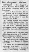 - [S9582] The Daily Item, Sunbury PA, Newspaper, obituary notice Margaret L Holland, published 24 Jan 1977 p 8.