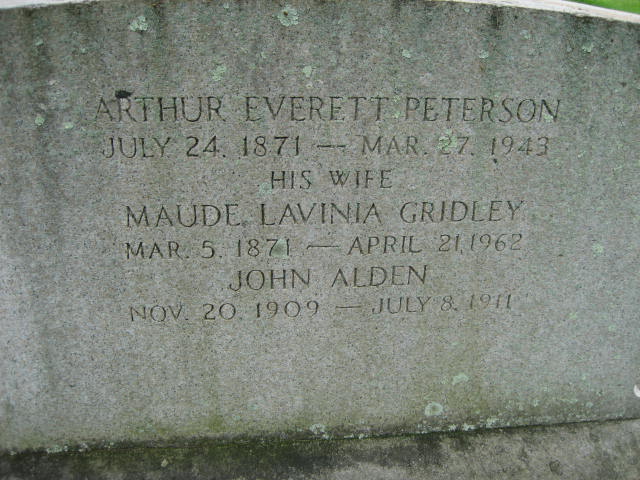 - [S6921] Find A Grave: Nathan Hale Cemetery, Coventry, Connecticut, Maude Lavinia Gridley Peterson, created by Sara, added Jul 2011, memorial number 73181539.