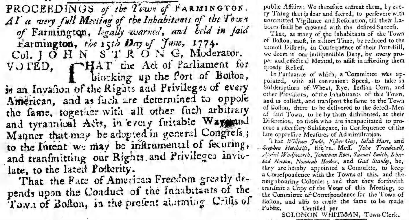 - [S4106] Hartford Courant, Hartford, CT, Newspaper, Newspaper notice for Farmington, published 21 Jun 1774 p 2.