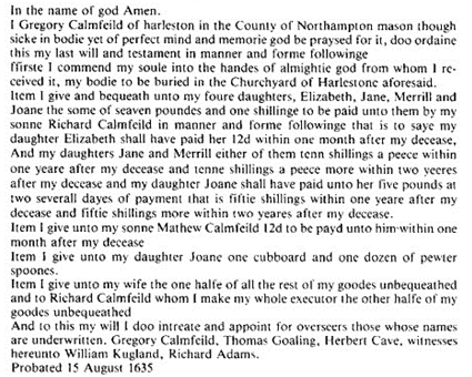 Prior to his death, he conveyed most of his real estate to three of his sons, John, Samuel, and Miles, Jr. In his will dated 18 May 1695 and proved 12 May 1697, Miles Merwin, Senior made bequests to his wife Sarah Merwin and her grandchildren, children of Sarah and John Pettet of Stamford; to John Scofell of Stamford; and to Mercy Camp, wife of Samuel Camp of Milford. He specified that any of his children who had not received their full portion should be given them by his executors;he named sons John, Thomas, Samuel, and Miles, and mentioned (but didnot name) daughters. To his ten grandchildren he left 100 lbs. amongthem, and to each one a bible. Land he had of Nathaniel Farran he gave to his son John's eldest child. Sons John and Miles were to be executors. Witnesses were Alexander Bryan, Josiah Plat, and Edward Nilkison.