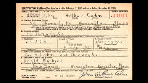 - In February 1942 John lived in 52 Thorndyke St, Worcester, Massachusetts.2