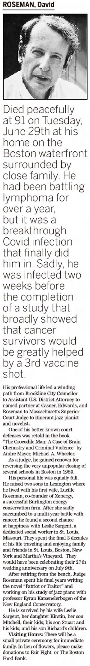 - [S6029] The Boston Globe, Boston, MA, Newspaper, David Roseman, obituary notice, published 2 Jul 2021.