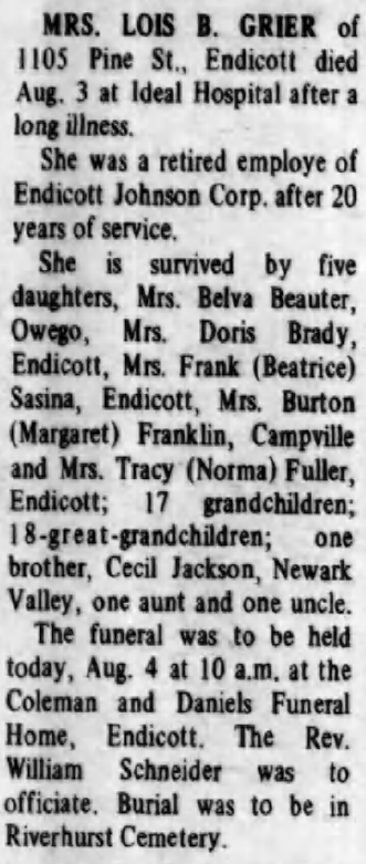 Funeral Services will be held at 2:30 p.m. Wednesday, December 29, 2004, at the First Baptist Church of Maine, N.Y. Burial will follow in Maine Cemetery. Friends are invited to call from 12 to 2:30 p.m. Wednesday at church preceding the funeral. The family requests that, in lieu of flowers, gifts be made in her memory to the BaYouCa Dining Hall Project, P.O. Box 204, Marathon, N.Y. 13803. Perkins Funeral Home, 55 West Main St., Dryden, N.Y., is assisting the family.