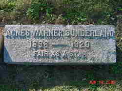 - [S2831] Find A Grave: Middlebury Cemetery, Middlebury, Vermont, Agnes Warner Sunderland, created by Robert Boehm Rathbun, date added Sep 2002, Memorial number 6741934,place=Middlebury Vermont, not correct.