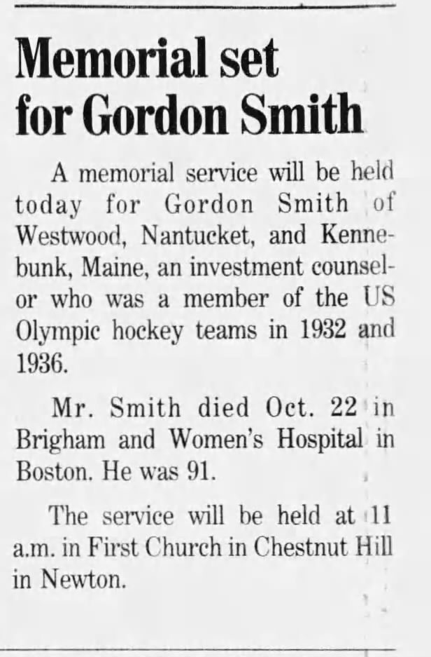 - [S6029] The Boston Globe, Boston, MA, Newspaper, Gordon Smith obituary notice, published 27 Oct 1999 p 65.