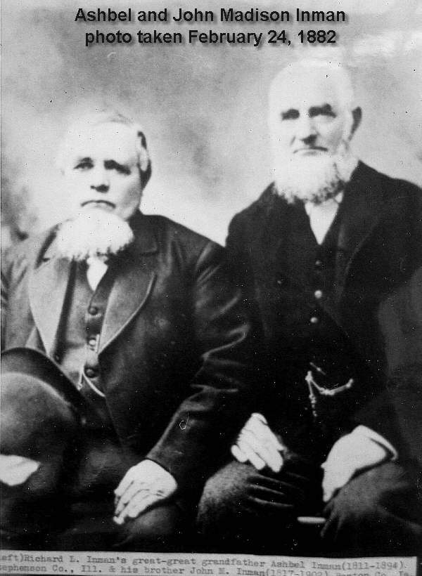 The subject our sketch is the descendent of an old Connecticut family, one of whose sons, the parental grandfather of our subject, migrated to Delaware County, N.Y., during its early settlement, where he built up a good home from the wilderness, and spent the remainder of his life. His son, Elsic, was reared to manhood in Delaware County, and married Miss Polly Sherwood, of English descent, whose father, upon coming to this country located in New York City. He died there when his daughter Polly was a young child. The latter was also deprived of a mother's care while young, and was reared by foster parents, with whom she remained until her marriage. This union resulted in the birth of two children only, Ashbel and his brother John. The latter resided on a farm in Worth County, Iowa. Elsic Inman served as a soldier in the War of 1812 becoming Orderly Sergeant, after which he was never heard from. The mother survived a number of years. and died at the home of her son, John, in Vinton, Benton County, Iowa.